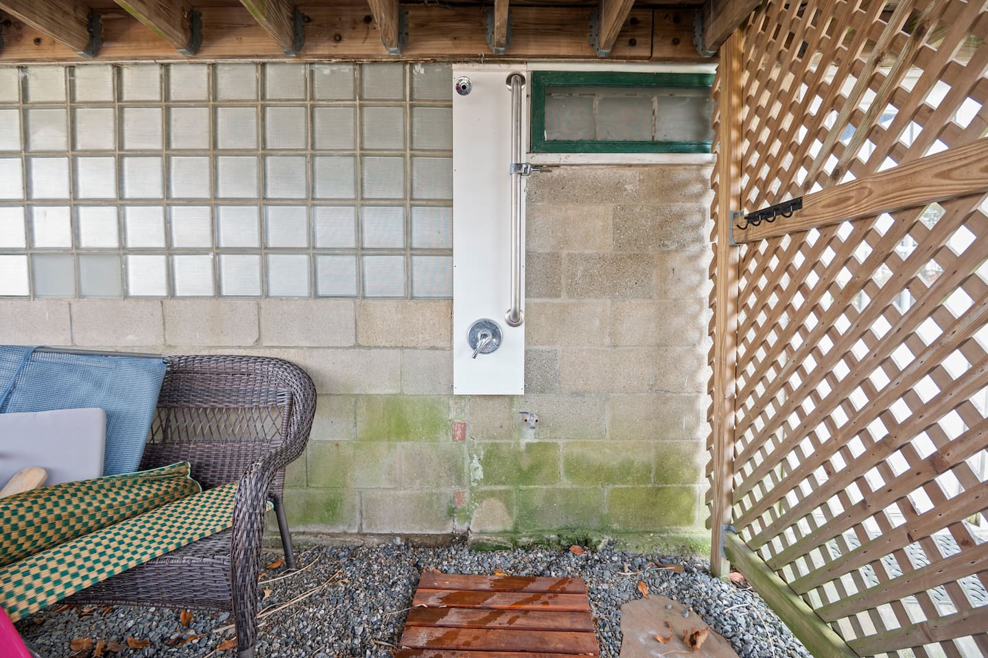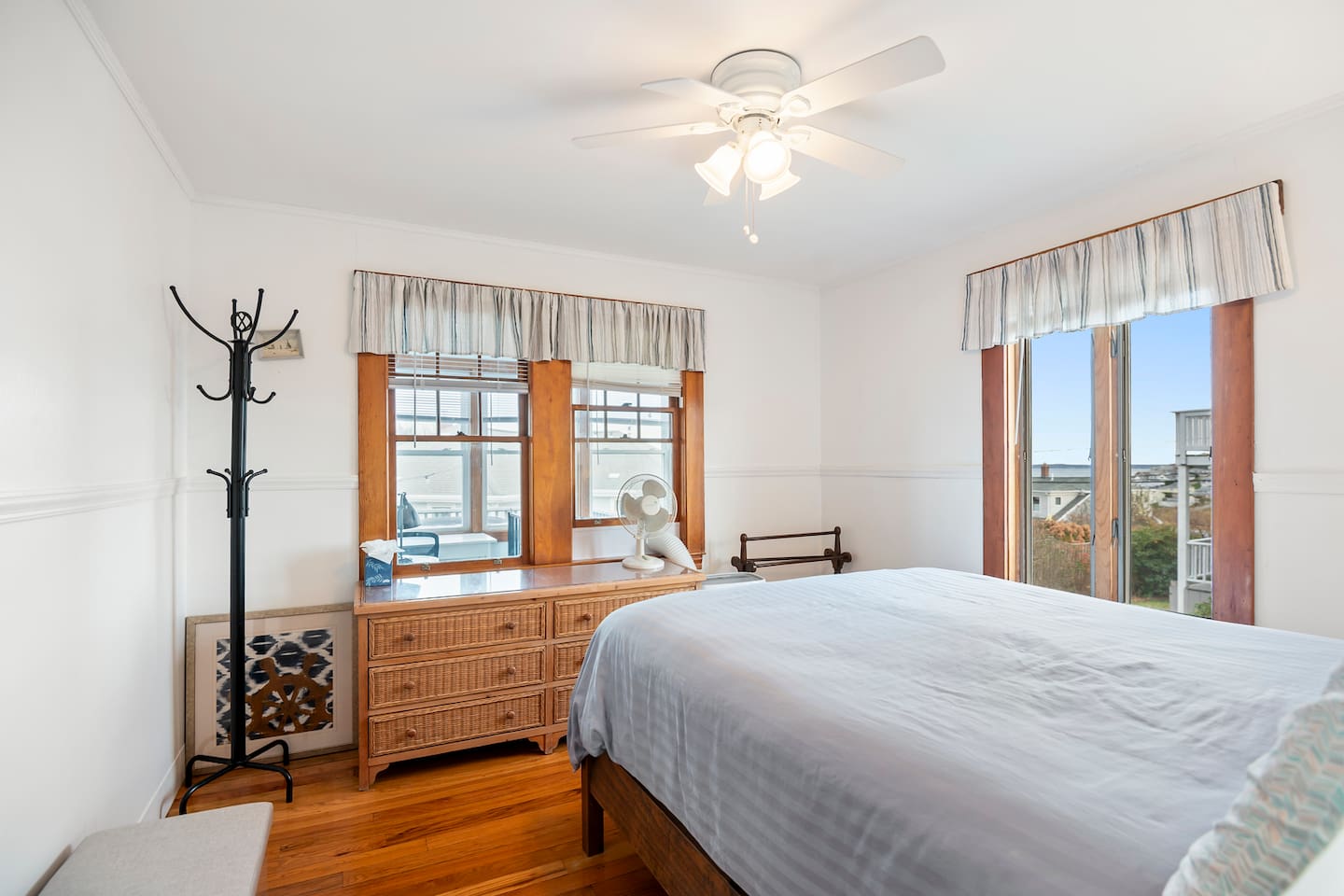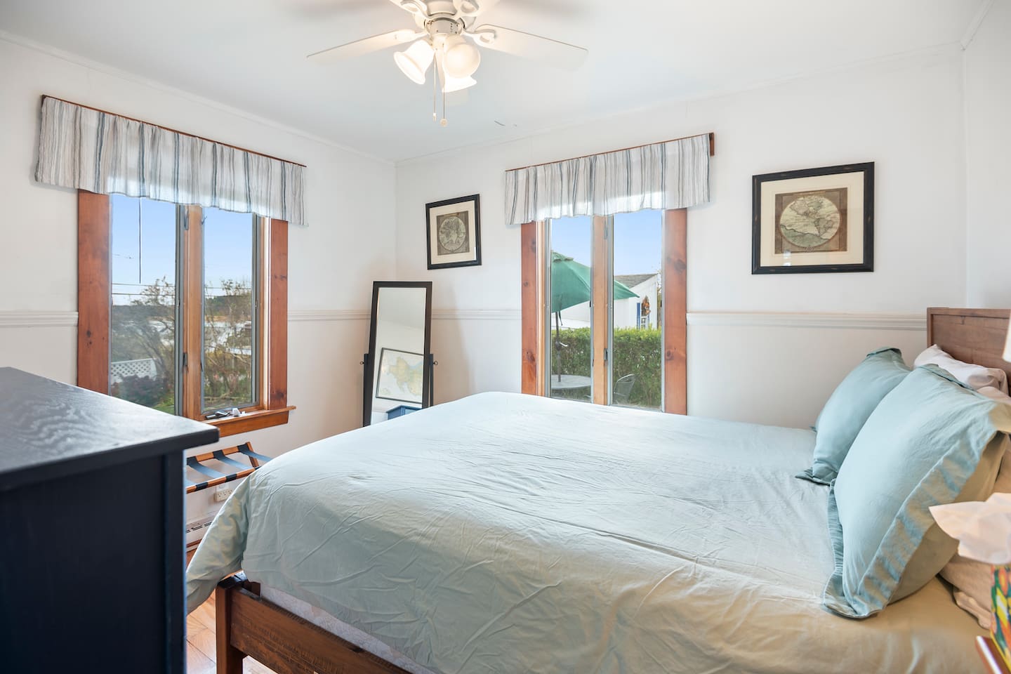 While it is a small house, there is great space inside. The living/dining area is open an has a nice view outside toward the ocean. The living area is comfy with nice sofas to really relax. Streaming and high speed wifi are standard, of course. There is a master bedroom with a side view of the ocean, so you can see a beautiful sunrise from the bed in the morning. It has a ceiling fan and air conditioning. The other bedroom has a queen bed and ceiling fan. Nice kitchen space with everything you need to entertain or cook. There is also a windowed-in with a desk and chair which faces the ocean and leads to the balcony where great views and barbecues can be had. The back yard is fenced in both for dogs to stay contained and for kids to play.