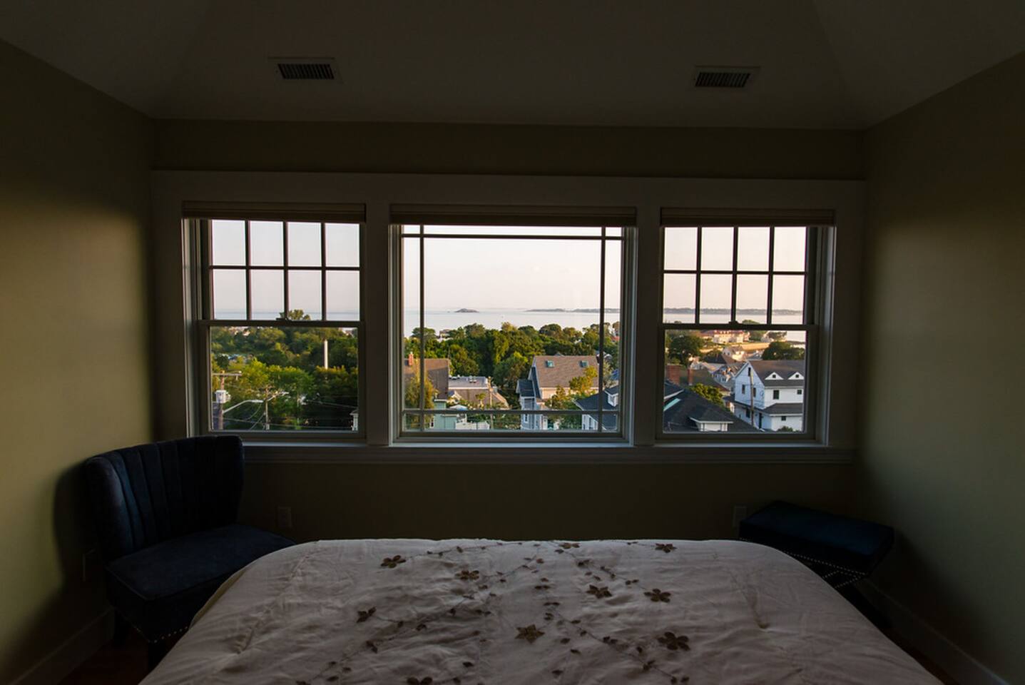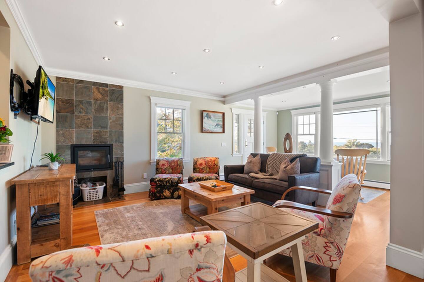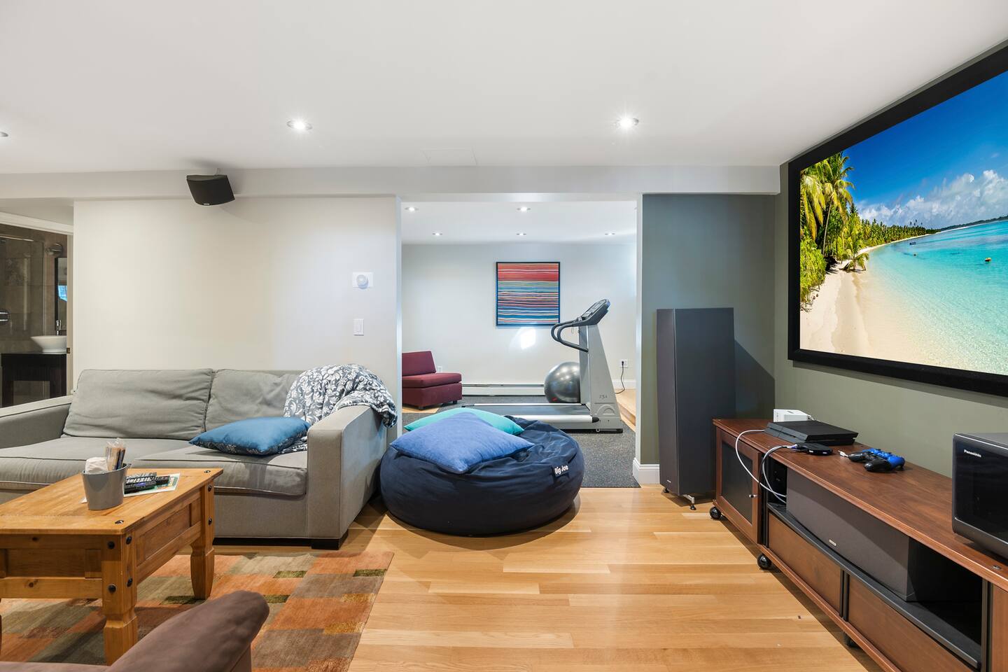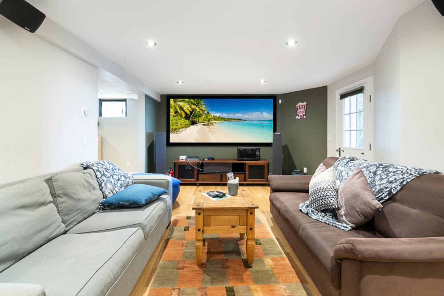Master bedroom with a magnificent view on the top floor. Great living space with an air-tight glass front fireplace with a view of the ocean from great big windows. Kitchen is packed with top-notch equipment. Downstairs is a surround sound video projector with cozy seating for everyone, with a foosball table and a gym. The balcony oversees the ocean view and is a great space for relaxing, having a sunny lunch, or watching the sunset.