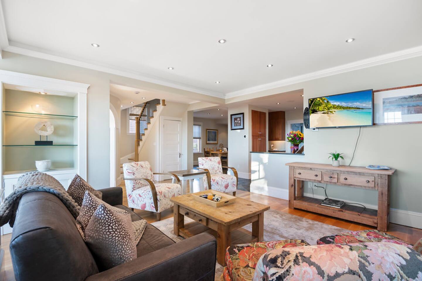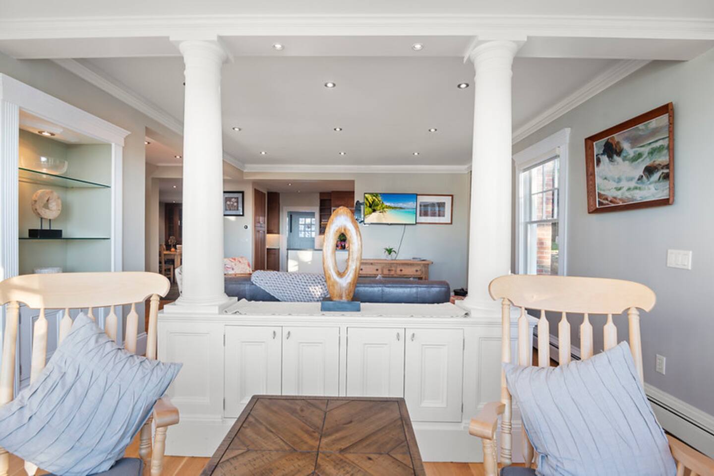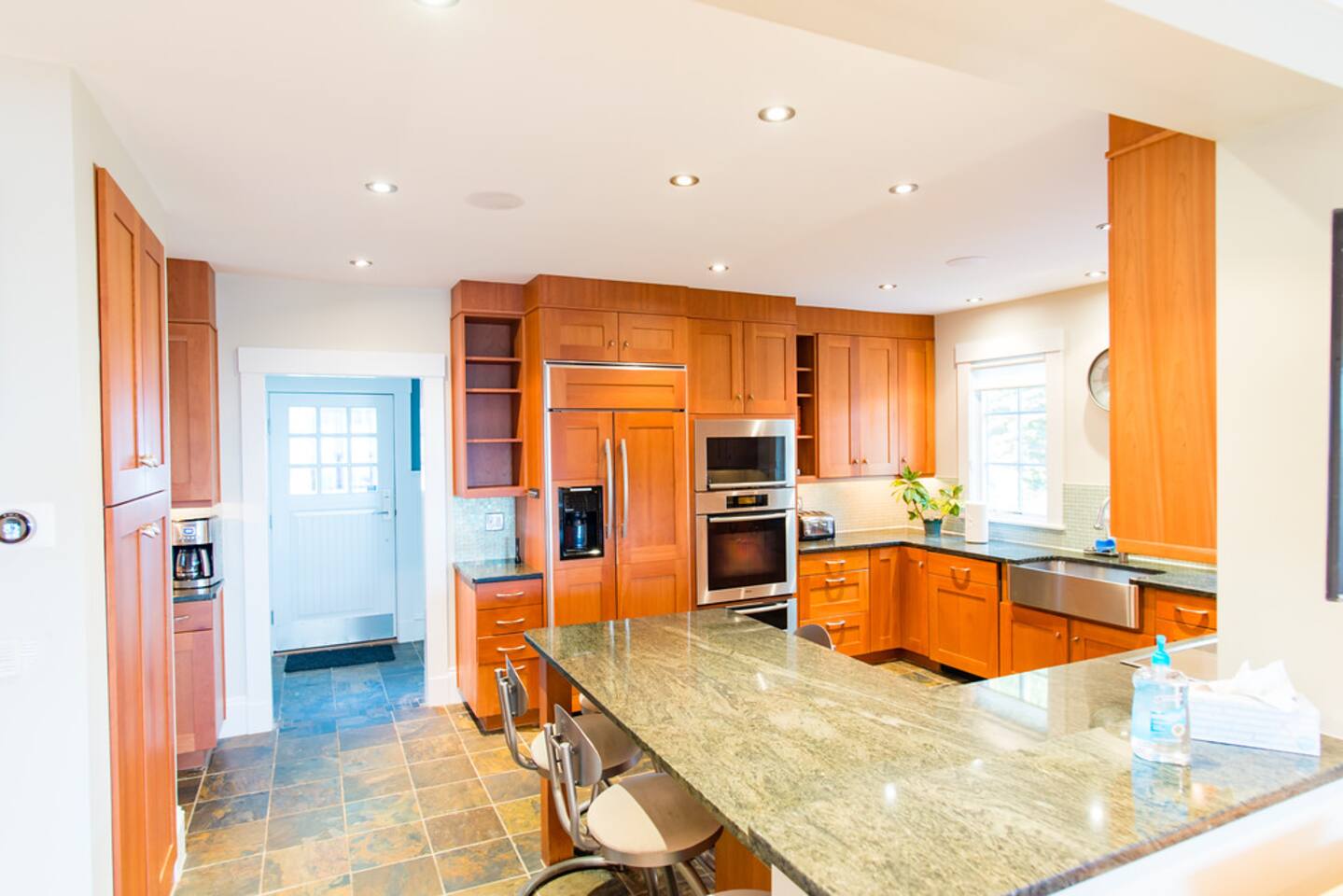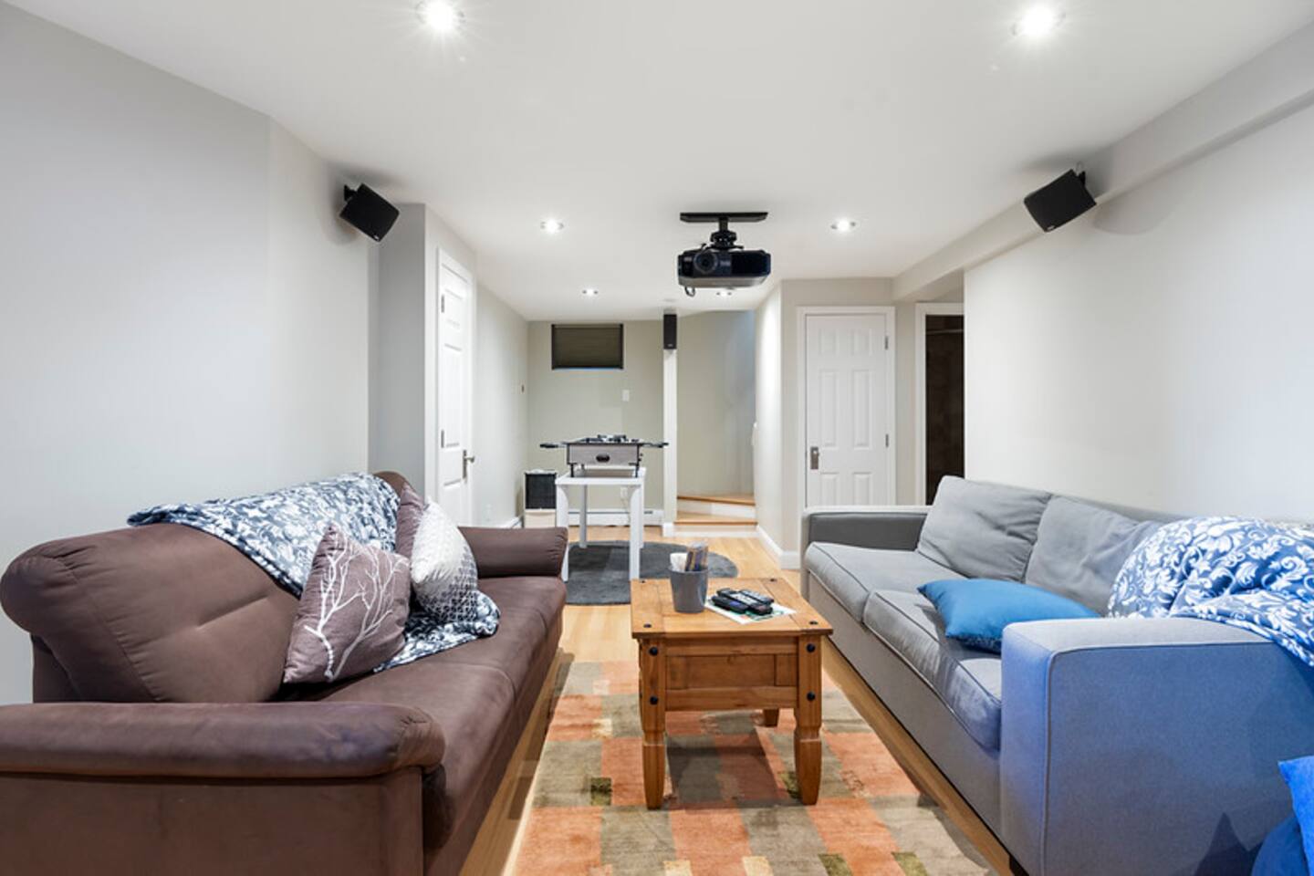 Master bedroom with a magnificent view on the top floor. Great living space with an air-tight glass front fireplace with a view of the ocean from great big windows. Kitchen is packed with top-notch equipment. Downstairs is a surround sound video projector with cozy seating for everyone, with a foosball table and a gym. The balcony oversees the ocean view and is a great space for relaxing, having a sunny lunch, or watching the sunset.