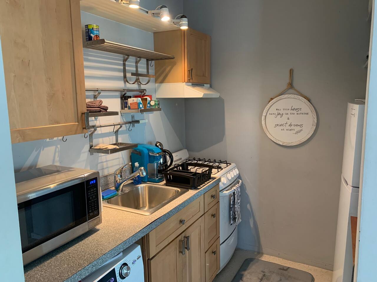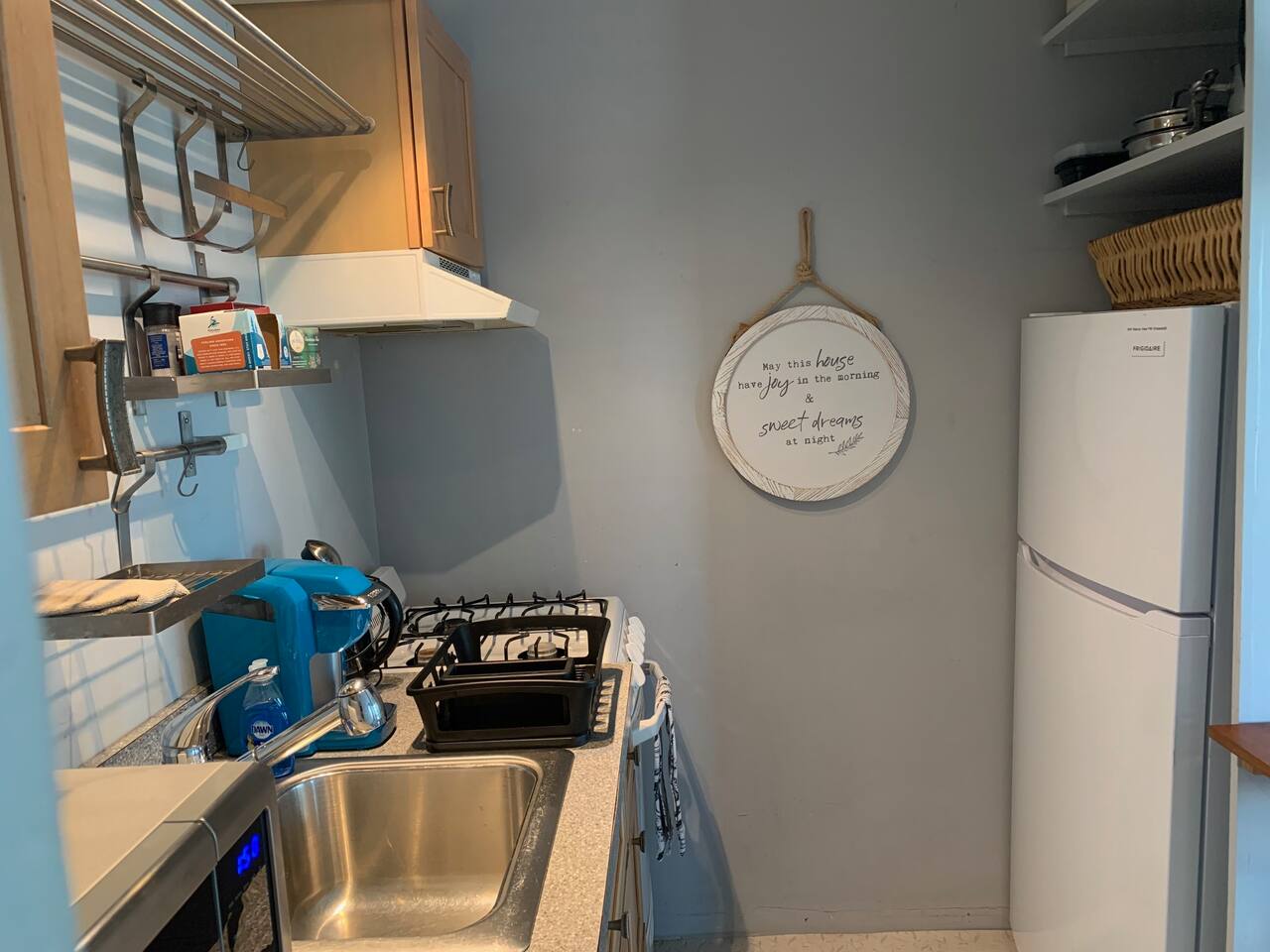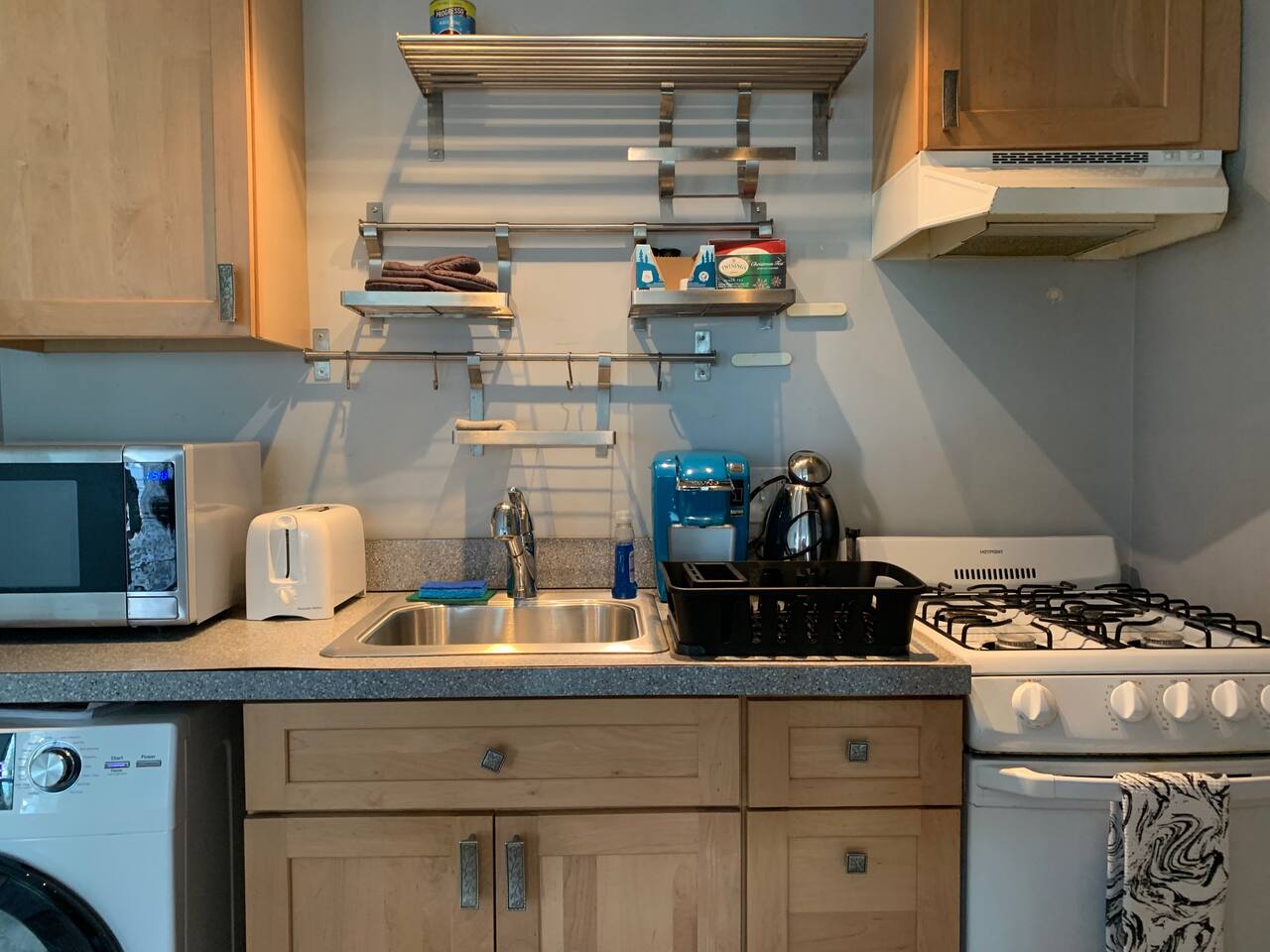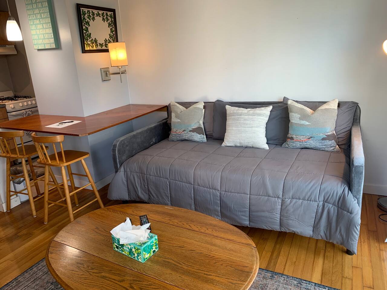 An open living and kitchen area with a hand-crafted high-top table that can be used for dining or working. All with a view to the water. Balcony with seating for 2 (extra chairs can be provided). Small bathroom. Bedroom with a full-sized post bed. Closet space and a small bureau. Neighbors are friendly :)