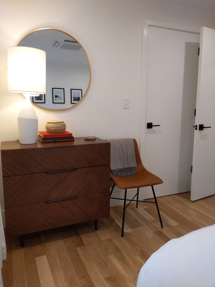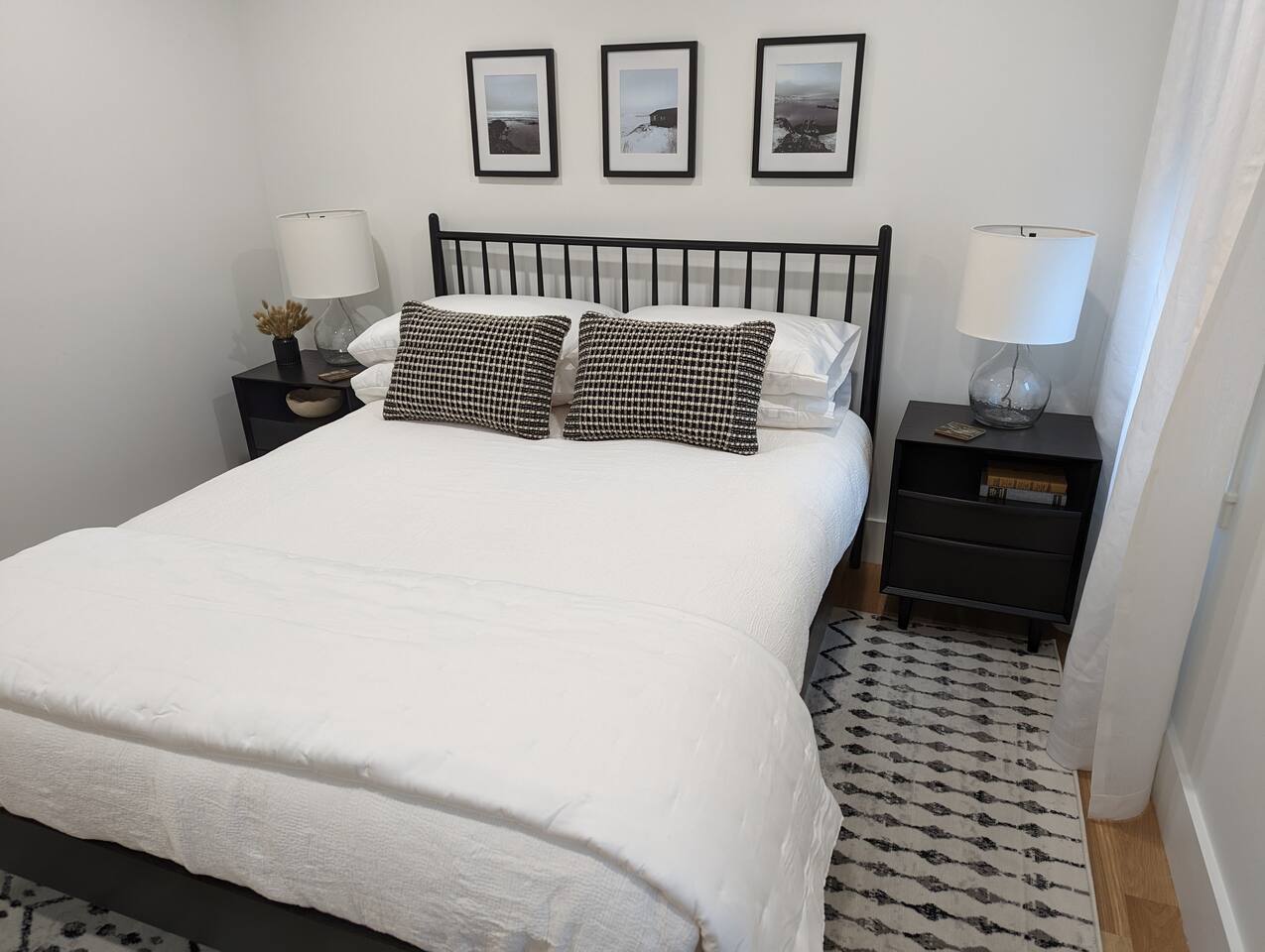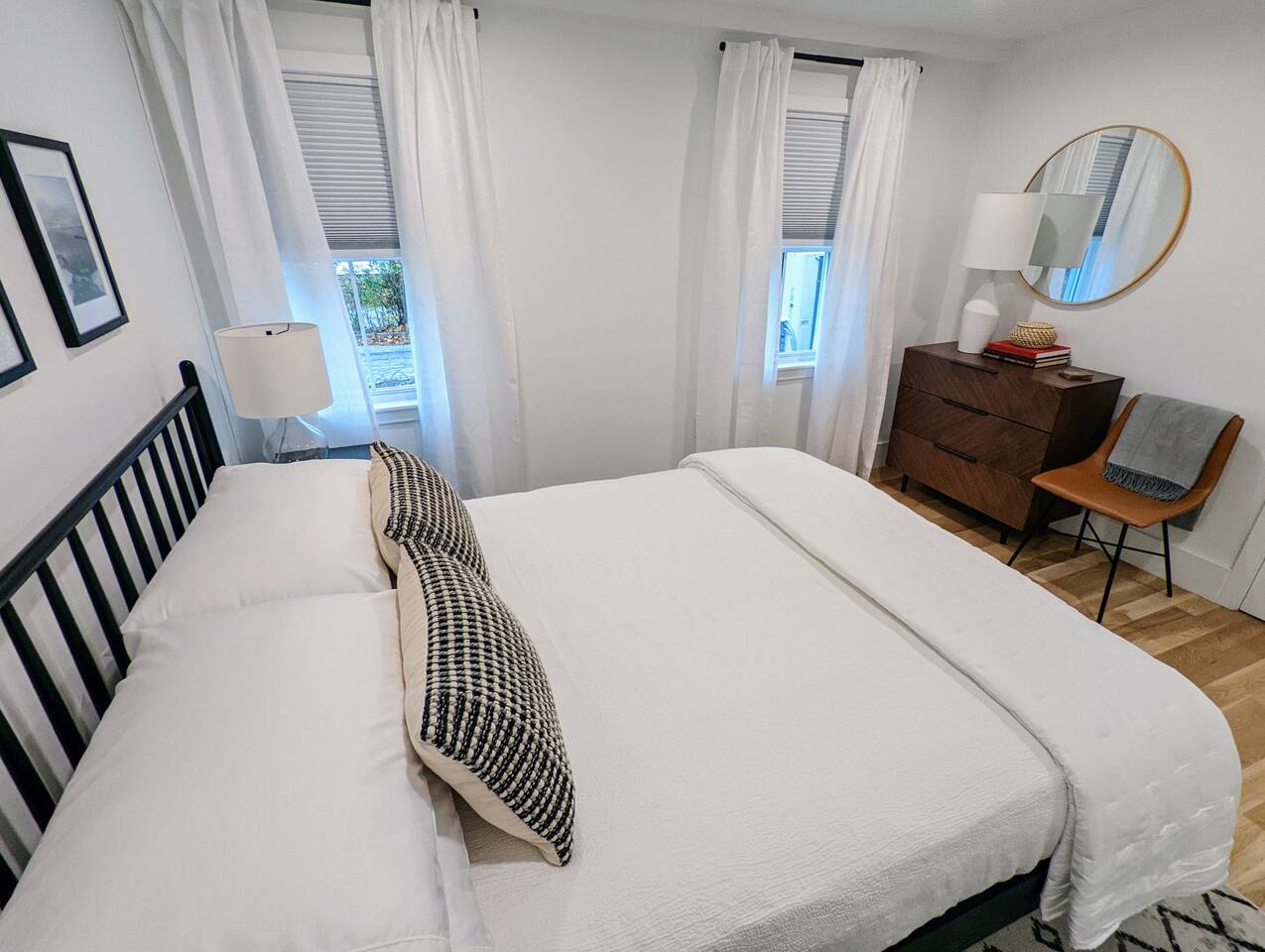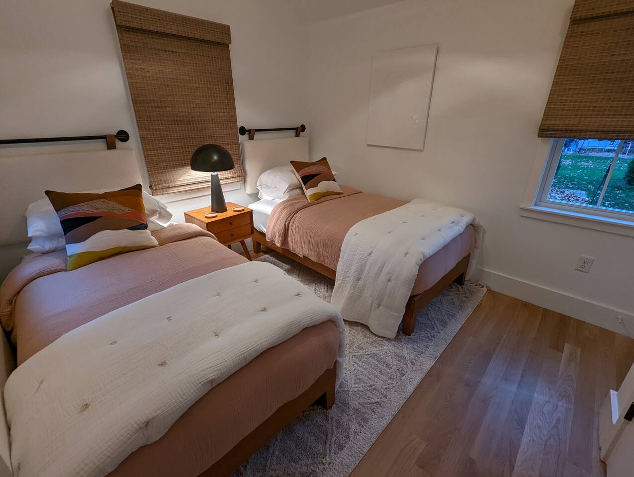 This is a completely private apartment next to another apartment, with a private entrance. It's packed with modern amenities including digitally controlled central heat and air conditioning, an ultra modern kitchen, a fully stocked Keurig coffee station, stainless microwave, stove and fridge, a luxurious Kohler bath, plush towels & linens, and a calming design aesthetic. The interior was decorated in a Nordic style that evokes "Hygge". The word hygge means: "giving comfort to someone" or "to console". The word has roots in ancient Norse, and the term reflects our English word “Hug”. So hygge is simply the feeling of being embraced by the wonderful things of the world. The Bell House Retreat offers that in spades. There's a gracious primary bedroom with a sumptuous queen bed, linen curtains and furnishings by Article Furniture, a secondary bedroom with twin beds. The kitchenette seating area offers vegan leather chairs and an expanding wood table from West Elm. Outside is a private patio seating for morning coffee. It's a perfect location for a family or couple visiting the area for graduations and sightseeing, or for those that simply need a relaxing Hygge retreat from the world.